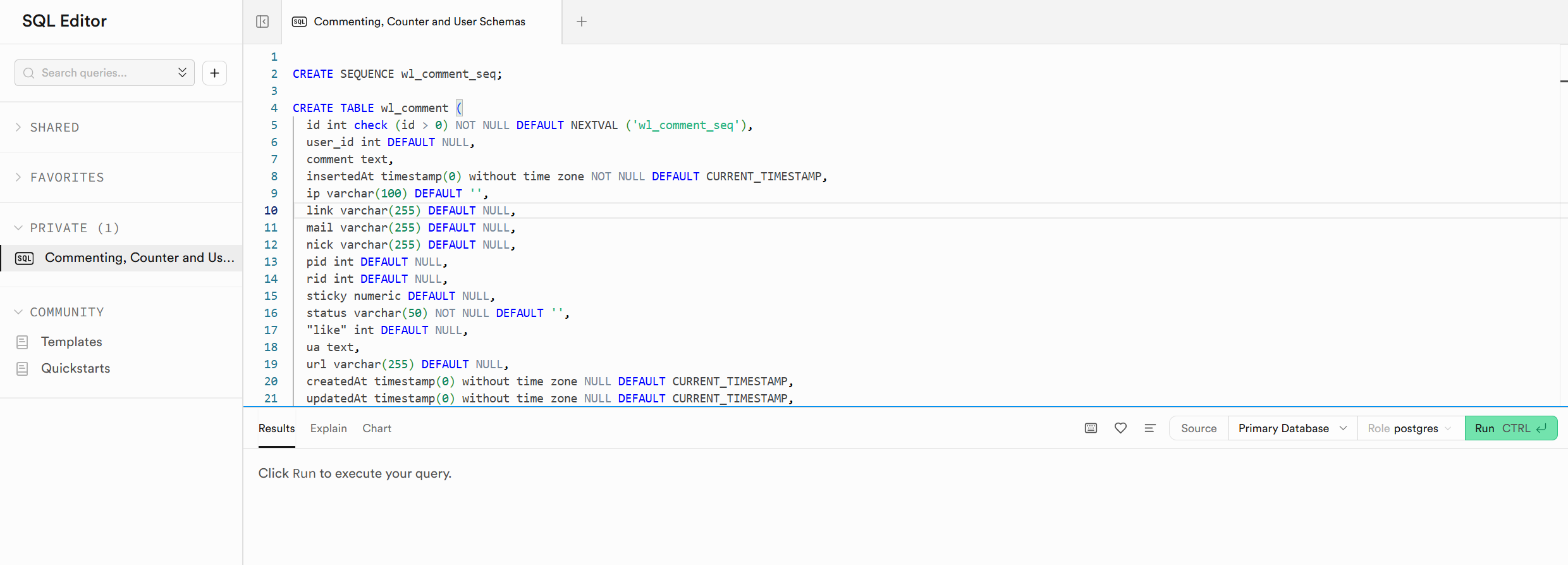 Waline 针对 PostgreSQL 不会自动建表。如果跳过这一步,后端启动时会报 500: relation "wl_users" does not exist