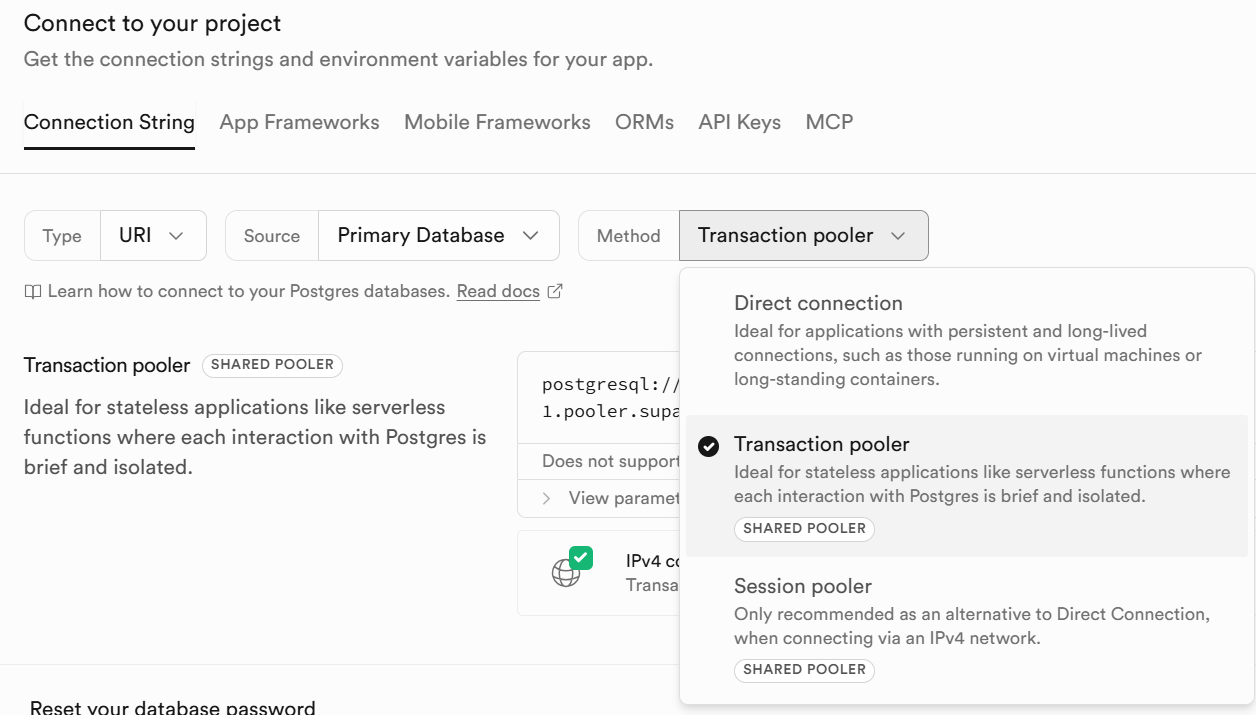找到 Method 选项,将默认的 Direct connection 修改为 Transaction pooler。
