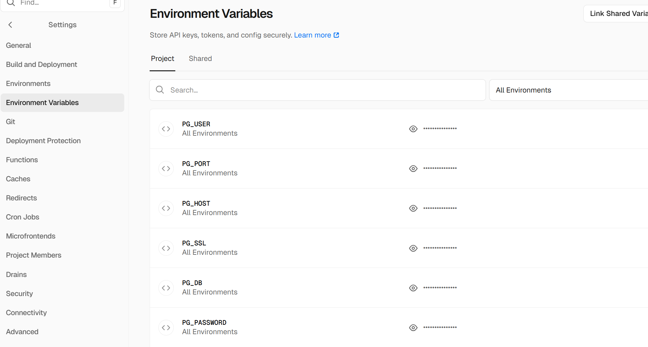 从vercel项目页面左侧进入Settings,然后点击Environment Variables,在右侧界面右上角点击Add Environment Variable将上述七个环境变量都添加。