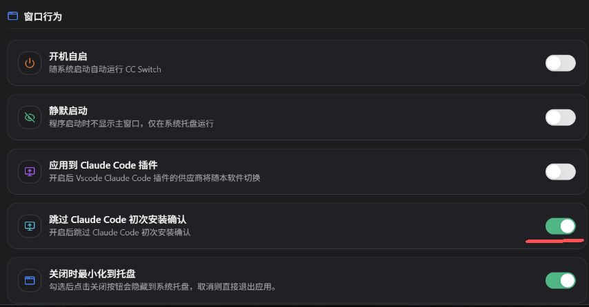 往下拉找到“窗口行为”并启动“跳过初次安装确认”即可